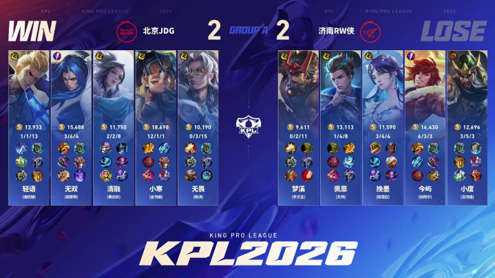 但是,随着装备的成型,团战RW侠还是难打,JDG只要整理好阵型,RW侠几乎找不到突破口。最后一波以无双的镜三杀结束,JDG率先拿下第一局的胜利!
